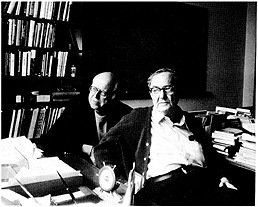 Herbert Simon won the Nobel Prize in Economics in 1978 for his work in bounded rationality. He is one of the founding fathers of modern research in artificial intelligence and the co-author, with the late Allen Newell (pictured above right with Simon), of the General Problem Solver program. He published Models of Thought, volume one, in 1979, and followed in in 1989 with a second volume. In the photograph on the left he is shown with one of the tools of the trade: The Tower of Hanoi. Here is his description of the Tower and its importance in cognitive research from his 1991 memoir, Models of My Life: